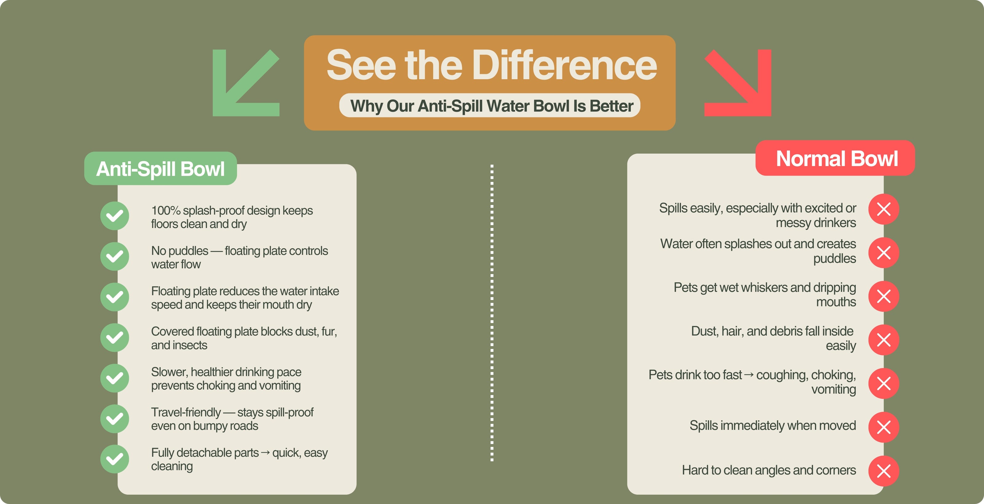 Traditional water bowls splash, spill, and let dust, hair, and dirt collect on the surface — leaving your floors wet and your pet drinking contaminated water. Our Pet Floating No-Spill Water Bowl uses a dual-layer design with a floating plate that controls water flow, prevents splashing, and keeps the water cleaner for longer. It reduces messy drinking, protects your floors, slows your pet’s drinking pace, and gives them fresh, hygienic water all day. The difference is simple: less mess for you, cleaner water for your pet.